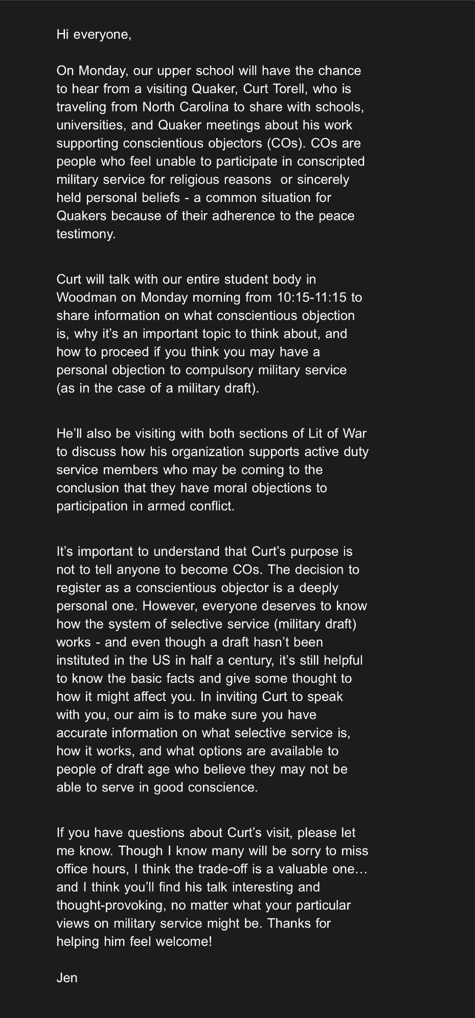 After Veterans Day, Jen McFadden used a mandatory Quaker meeting to host a talk on conscientious objection/conscientious objectors (COs), framed as support for the school’s “peace testimony.” COs are people who feel unable to participate in active duty military service for religious reasons or sincerely held personal beliefs.